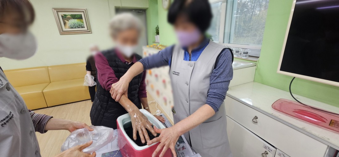 어르신들이 따끈한 왁스에 손을 담그실 때마다 "아유, 좋다!" 하는 탄성이 끊이질 않았어요.