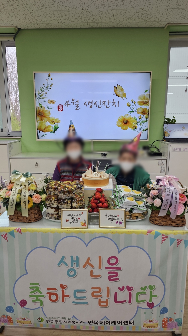 화사한 노란 꽃 장식과 함께 "4월 생신잔치" 문구가 적힌 화면이 분위기를 화사하게 띄웠고,