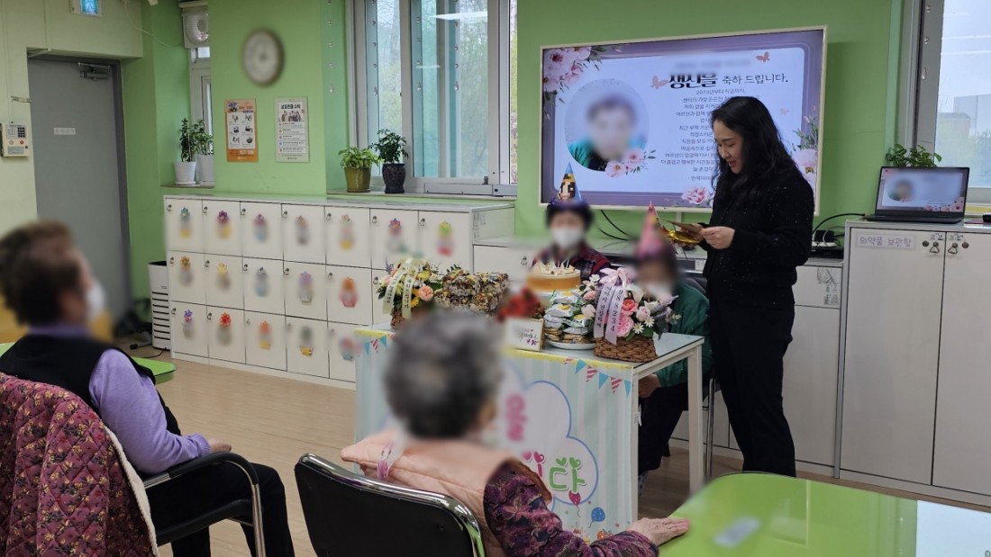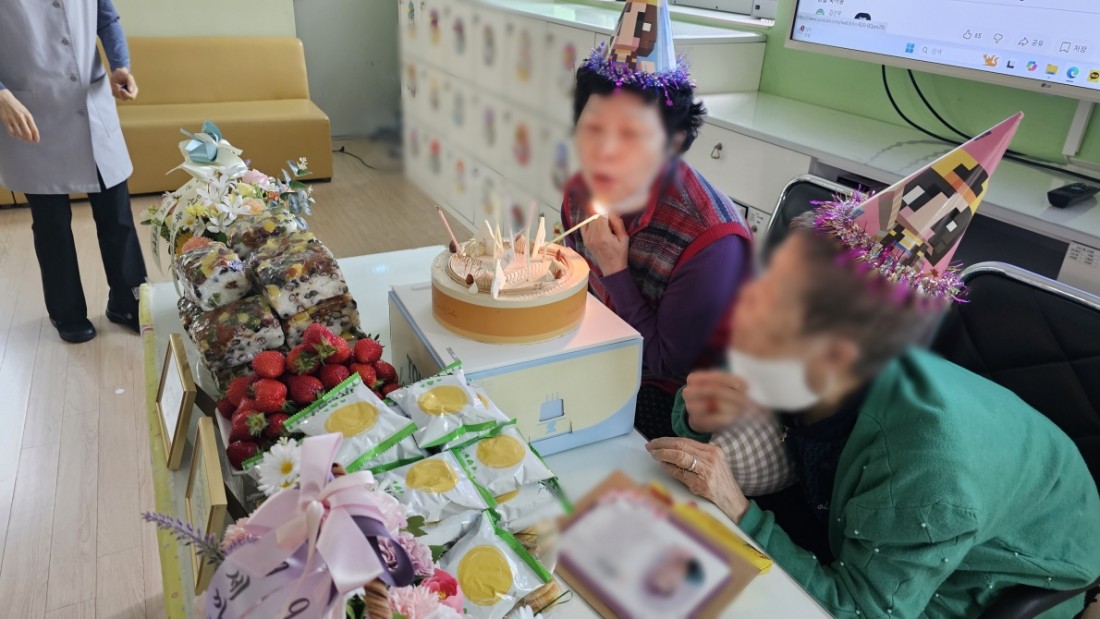 생신을 맞으신 두 분 어르신께서는 예쁜 생일 모자를 쓰시고 환한 미소로 자리를 빛내주셨습니다.