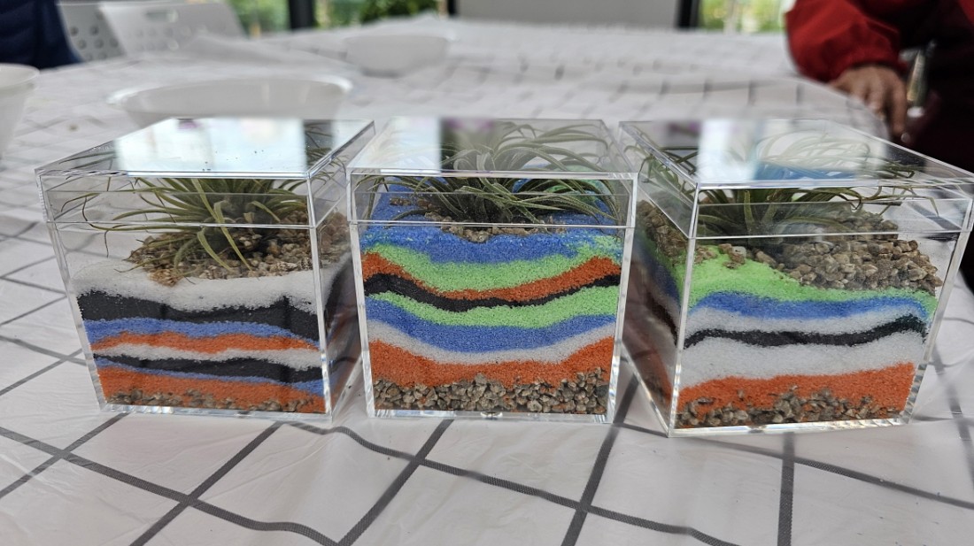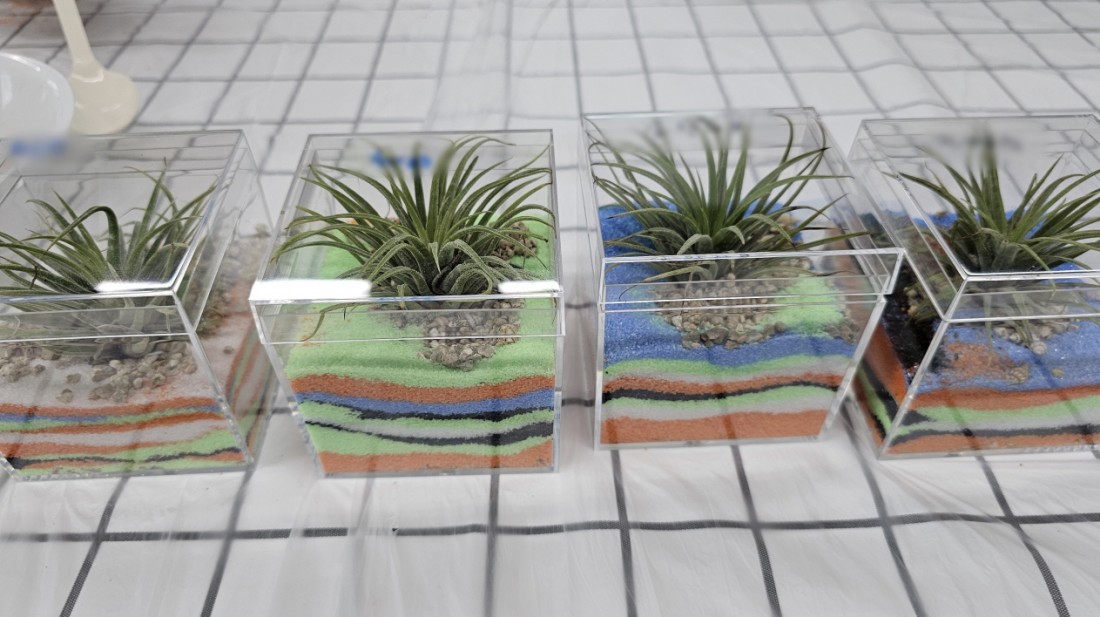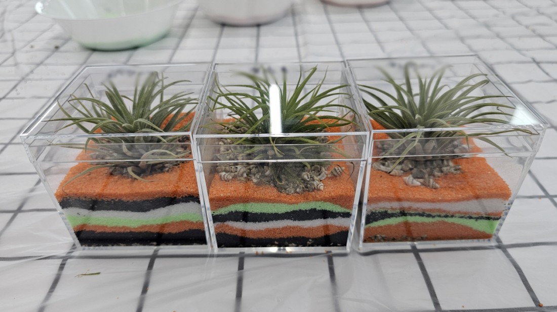 이오난사와 색깔 모래를 활용해 각자의 개성을 담은 작은 정원을 완성하며,