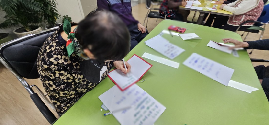 엽서에 어르신들의 마음을 담기 위해 애쓰는 모습으로
