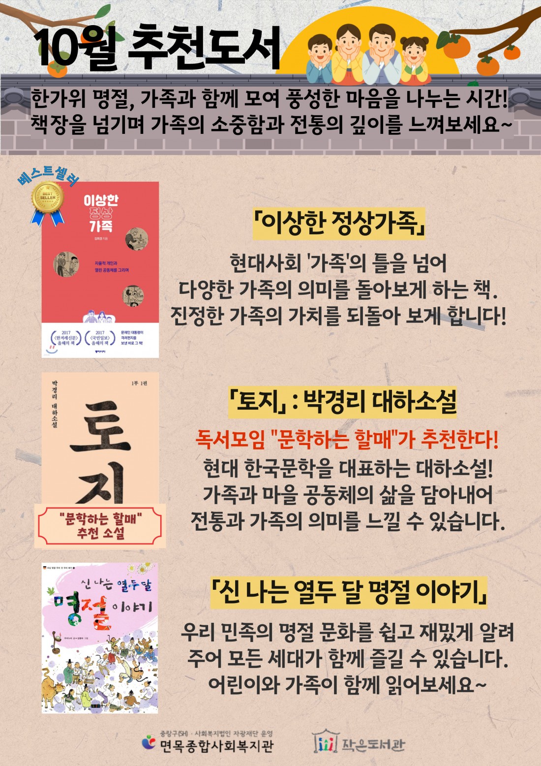 [이달의 책] 10월 - 한가위 명절 맞이 추천도서 페이지 정보 작성일 25-10-13 10:46 본문 이달의 추천도서는 아름인도서관에서 만나보실 수 있습니다. 문의) 원형주 사회복지사 ☎ 070-4399-5035 목록