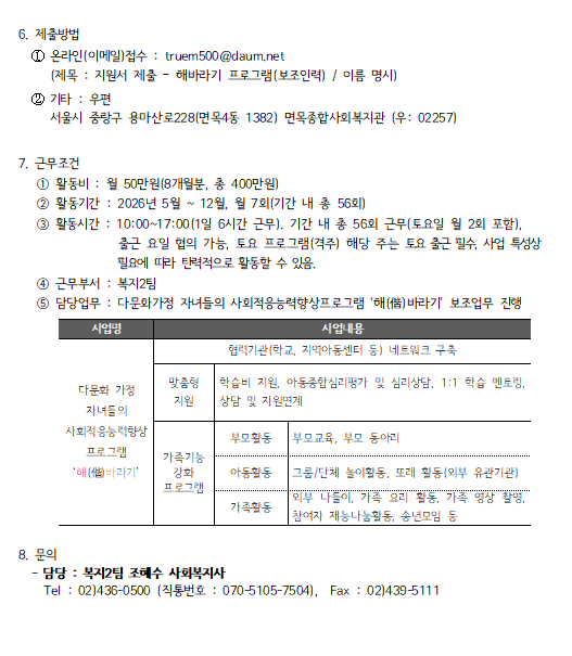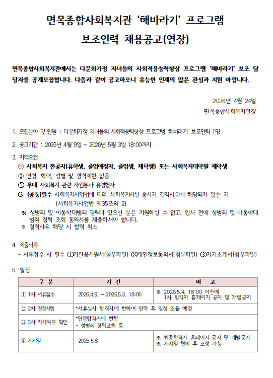 2026년 다문화가족지원사업 '해바라기' 사업 보조인력 채용 공고(연장) > 공지사항