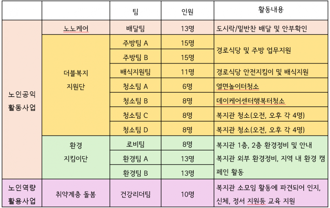 4. 노인역량활용사업 : 활동시간 주 5회(일 3시간) / 월 60시간 이상 활동 활동비: 월 76만원(주휴수당 포함)