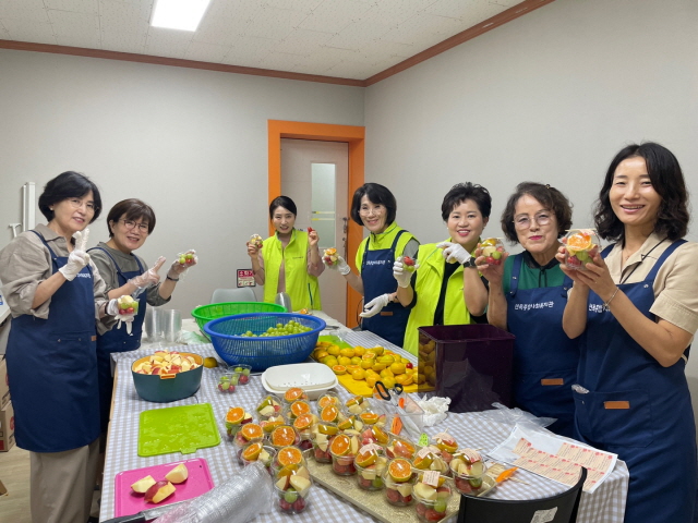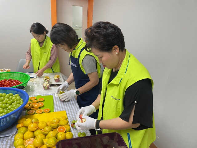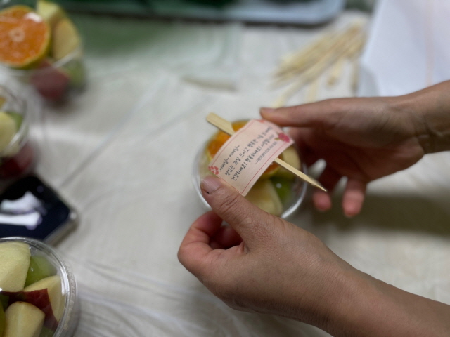 예쁜 과일들이 담기니 "색감 예쁘다~ ", "어르신들 좋아하시겠다~" 등 이야기들이 오갑니다