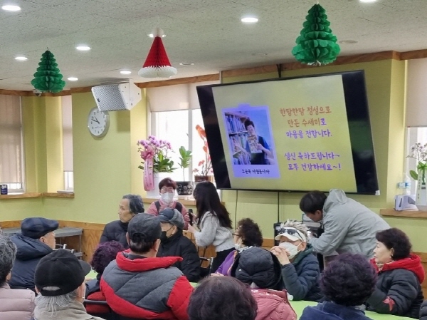 더불어, 이번달은 특별히 경로식당에서 배식 봉사활동을 하고 있는 조 선생님이 한땀한땀 손수 만든 손뜨개 수세미도 생신자 어르신들께 전했습니다.