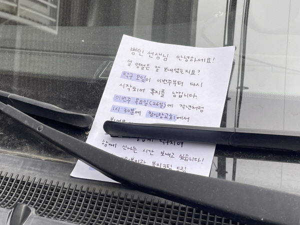전화통화가 어려운 병인님은 집 앞 차량에 쪽지를 남겼습니다.