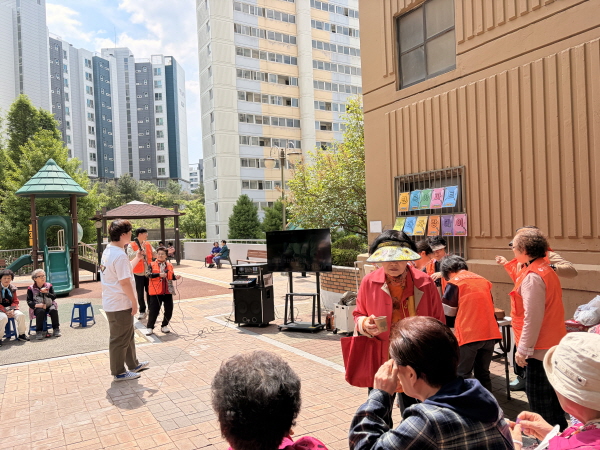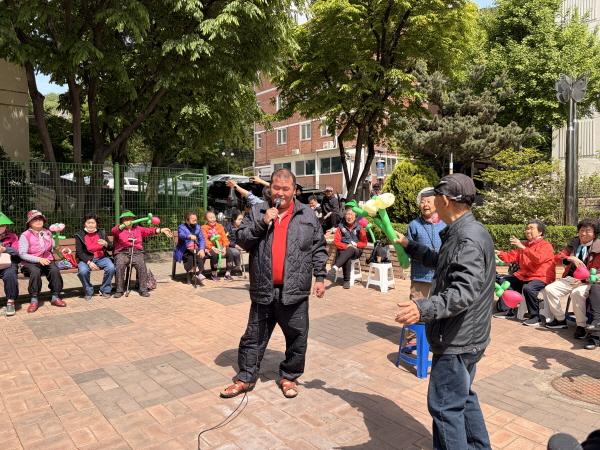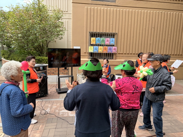 복지관 선생님들이 무거운 노래방 기계와 TV를 옮기고, 3동 앞 놀이터 공간에 멋진 한 마당이 펼쳐졌습니다